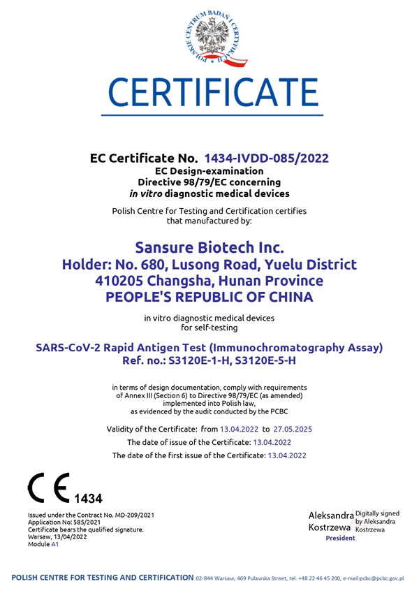 美高梅mgm1888生物新冠快速抗原检测试剂自测产品取得欧盟CE1434自测证书,表明公司免疫检测产品性能获得官方机构认可,进一步丰富了美高梅mgm1888生物全场景化新冠检测解决方案,扩大和满足了全球市场各级检测防控需求,为全球疫情防控工作持续助力。