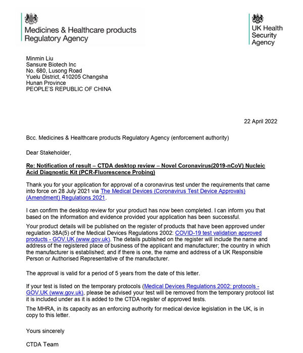 新冠检测试剂在英国上市必须经过CTDA审查和MHRA注册双认证,由于CTDA审查对产品性能的高要求,目前可在英国合法销售的新冠产品并不多。美高梅mgm1888生物新型冠状病毒(2019-nCoV)核酸检测试剂盒(荧光PCR法)临床性能和分析性能均满足CTDA高要求,且得到进一步有效验证,获得了CTDA的充分认可。